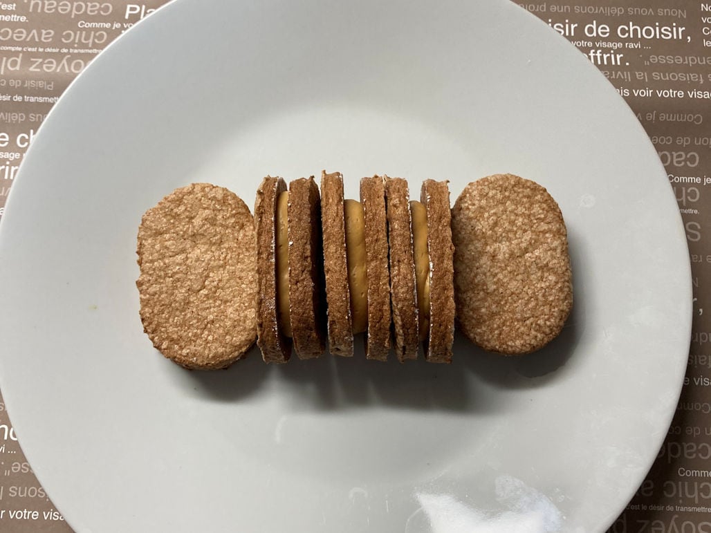 マルコナアーモンドパウダーを使ったダックワーズに、キャラメルのバタークリームをサンドしました。