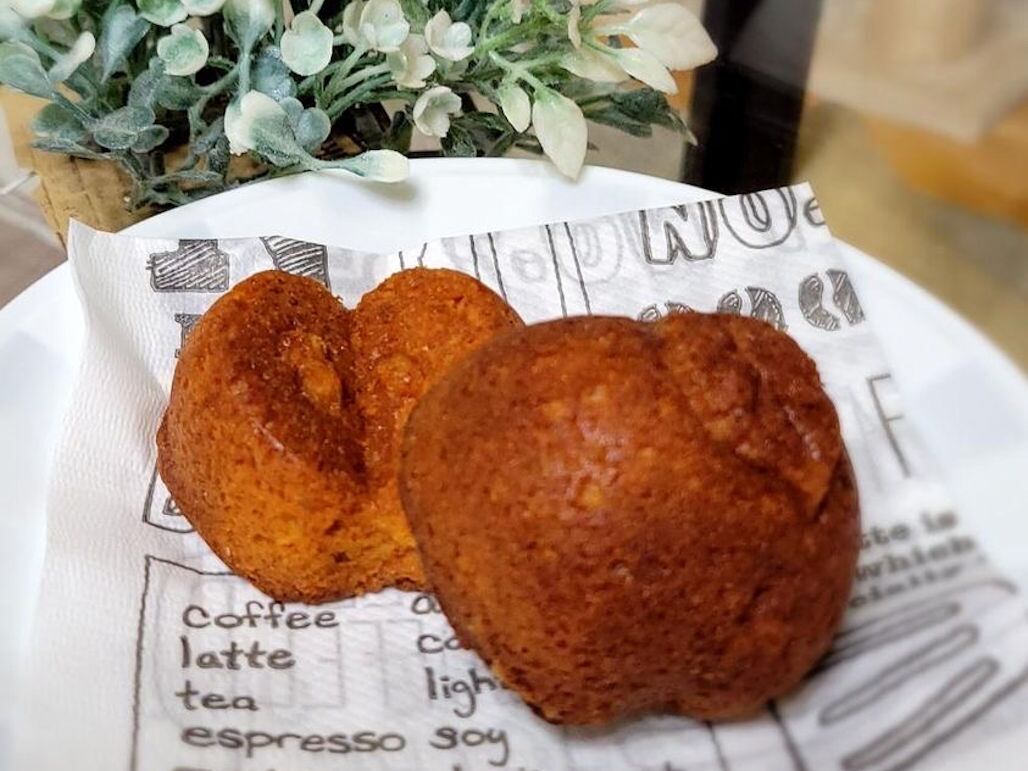 ドライアップルを細かくきざみ、キャラメルと隠し味にオレンジピールをペースト状にして生地に練り込みました。